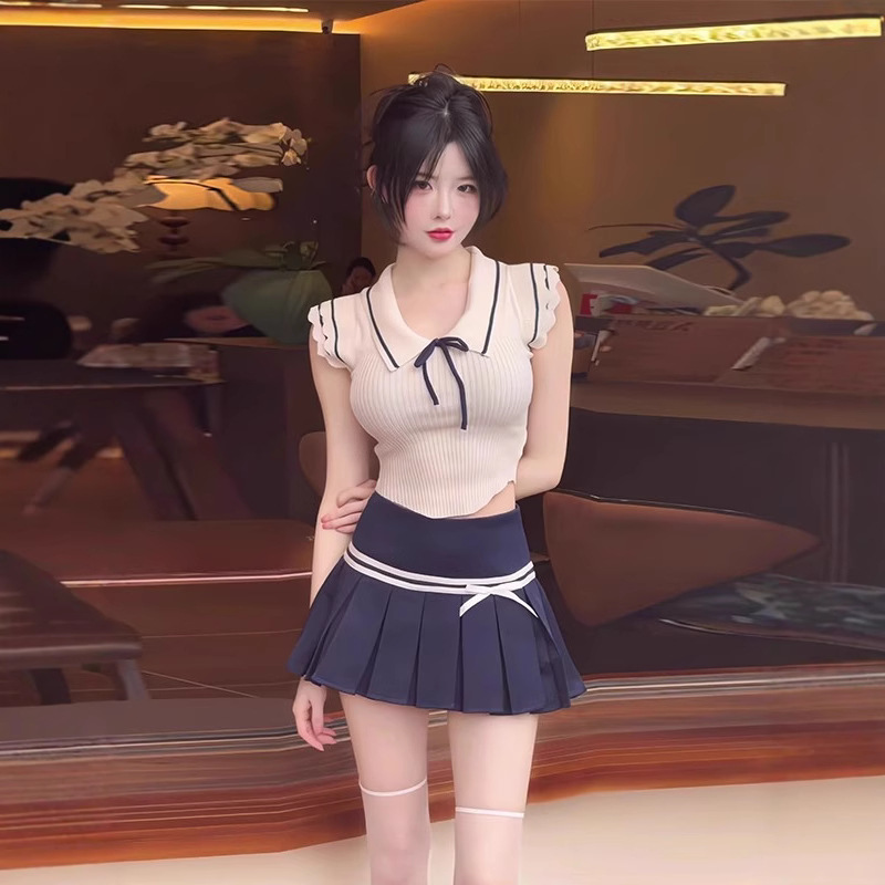 Baju Atasan Pinggang Tanpa Lengan Seragam Gaya JK Gaya Murni Gaya Sekolahan Rok Lipit Slim-fit Sambungan Korea Dua Set Rok Pendek