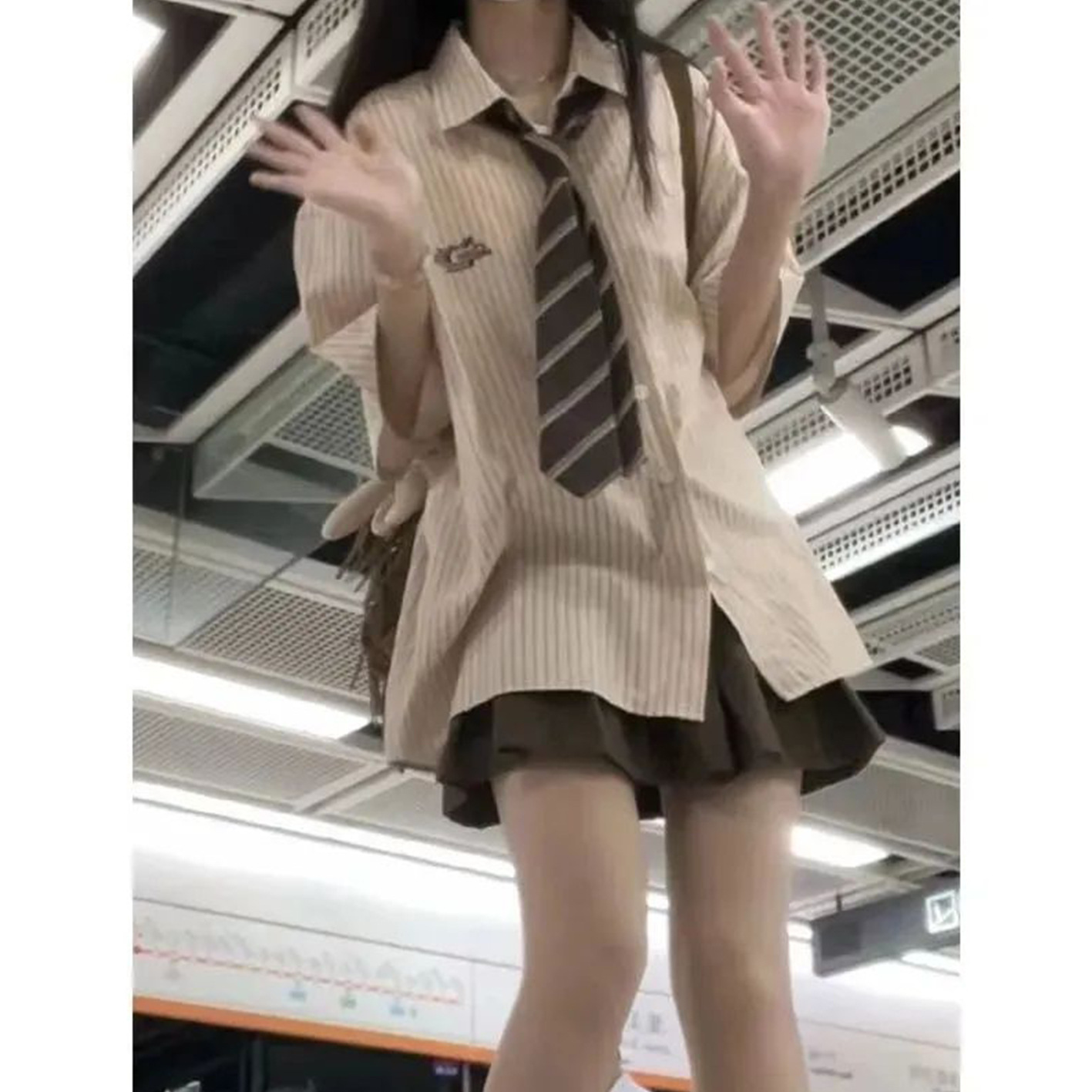 Kemeja Garis-garis Vertikal Gaya Hongkong Model Baru Musim Panas Seragam JK Kemeja Kardigan Merek Trendi Mudah Dipadu Padan Wanita Lengan Pendek Atasan Wanita