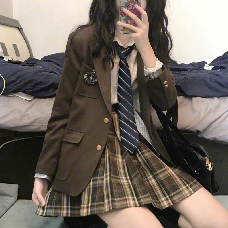JK setelan seragam wanita musim gugur dan musim dingin, setelan seragam wanita, mantel penuh, mantel sweater, rok kotak-kotak, Miss Charlotte