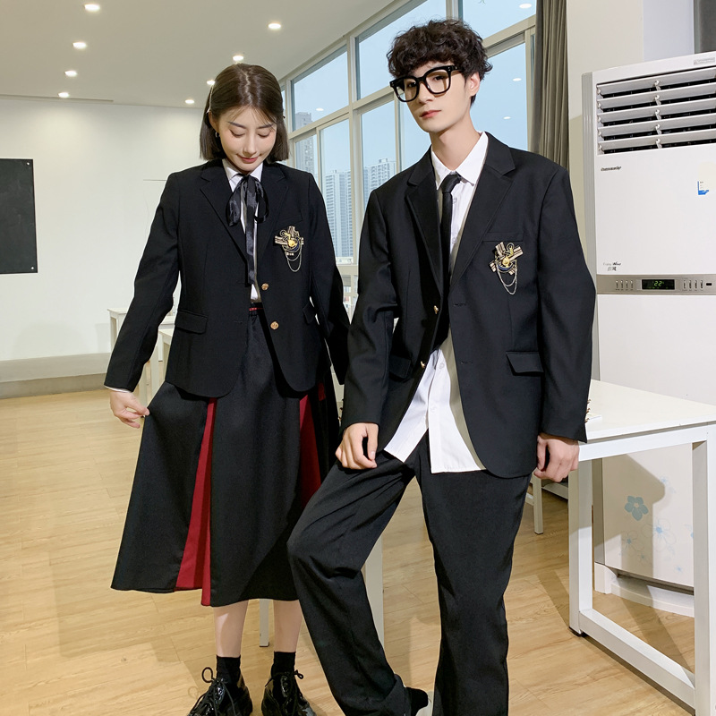 Setelan seragam sekolah hitam pria dan wanita, gaya kuliah Korea Musim Semi dan Musim Gugur 2022