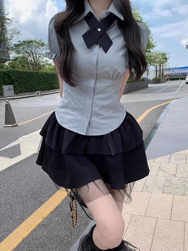 JK seragam gadis kecil manis atasan ramping ikatan simpul wanita + rok pettiskirt a-line setelan dua potong