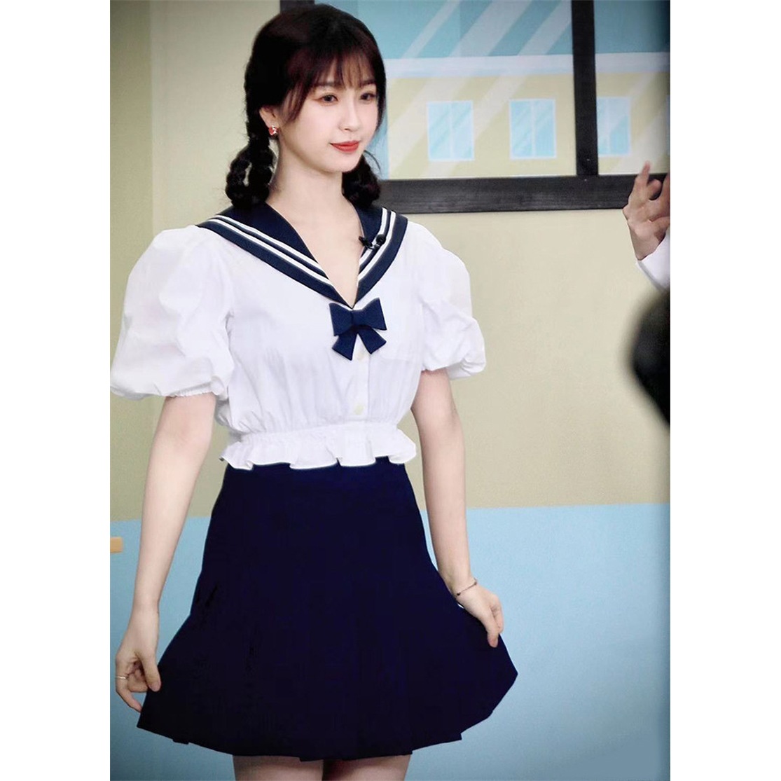Yu Shuxin setelan rok lipit pinggang tinggi atasan lengan puff boneka kerah angkatan laut gaya preppy seragam JK manis