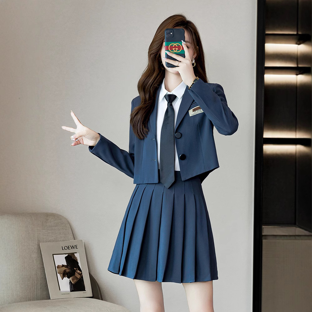 Jk setelan seragam gaya kuliah Korea setelan rok pendek jaket jas wanita gaya Inggris rok berlipat gaya Barat