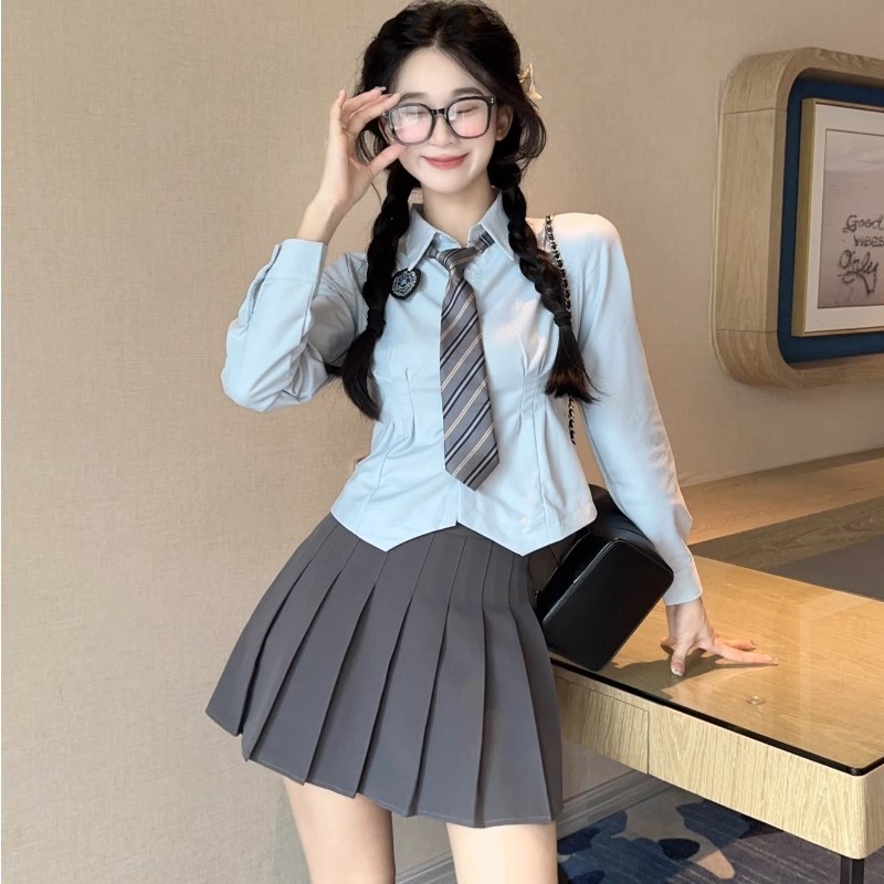JK Kemeja Warna Biru Pelangsing Pinggang Wanita Rok Lipit Gadis Pedas Lengan Panjang Set Seragam Gaya Sekolah Jepang Terlihat Ramping Mudah Dipadu Padan