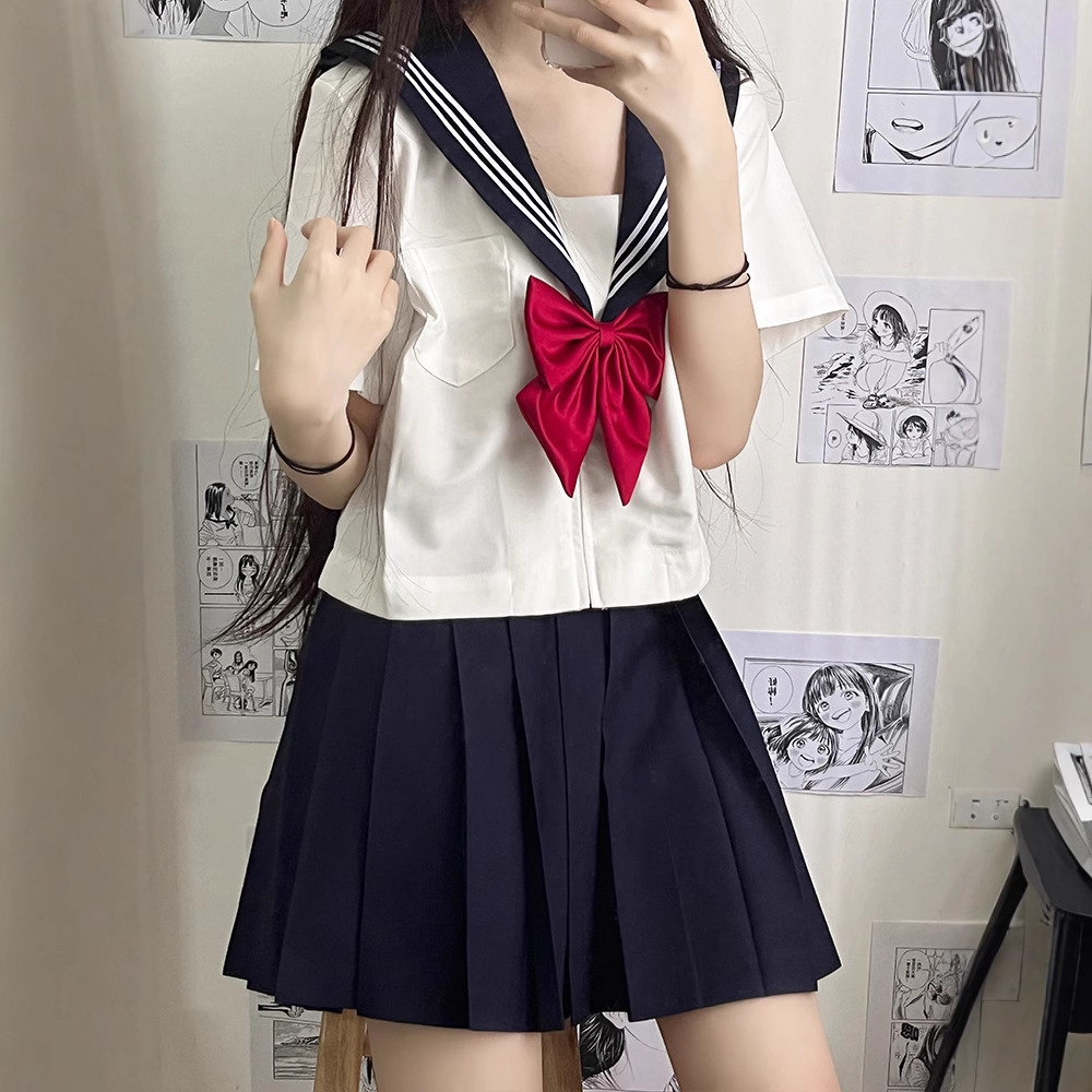 Setelan Pakaian Seragam JK Gaya Sekolah Jepang Gaya Kampus Atasan Musim Panas Wanita Baju Atasan Rok Lipit Dua Set Gaun