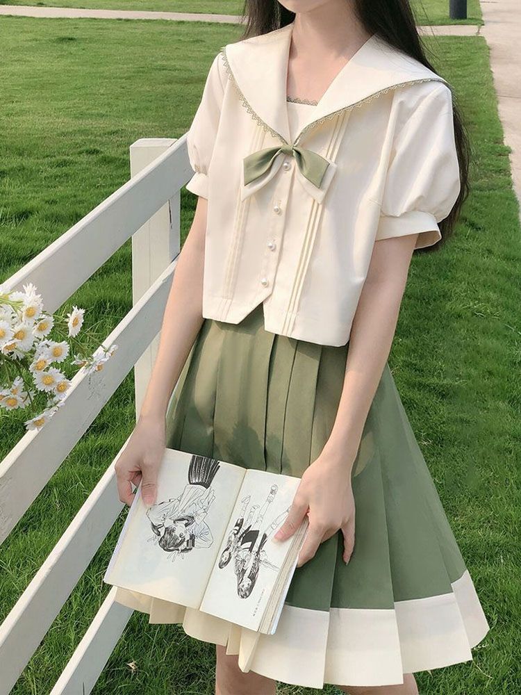 Setelan Seragam Sanye JK Setelan Sailer Pakaian Tengah Hijau Milk Mint Gadis Musim Semi Musim Panas Gaya Jepang Setelan Rok Seragam Wanita