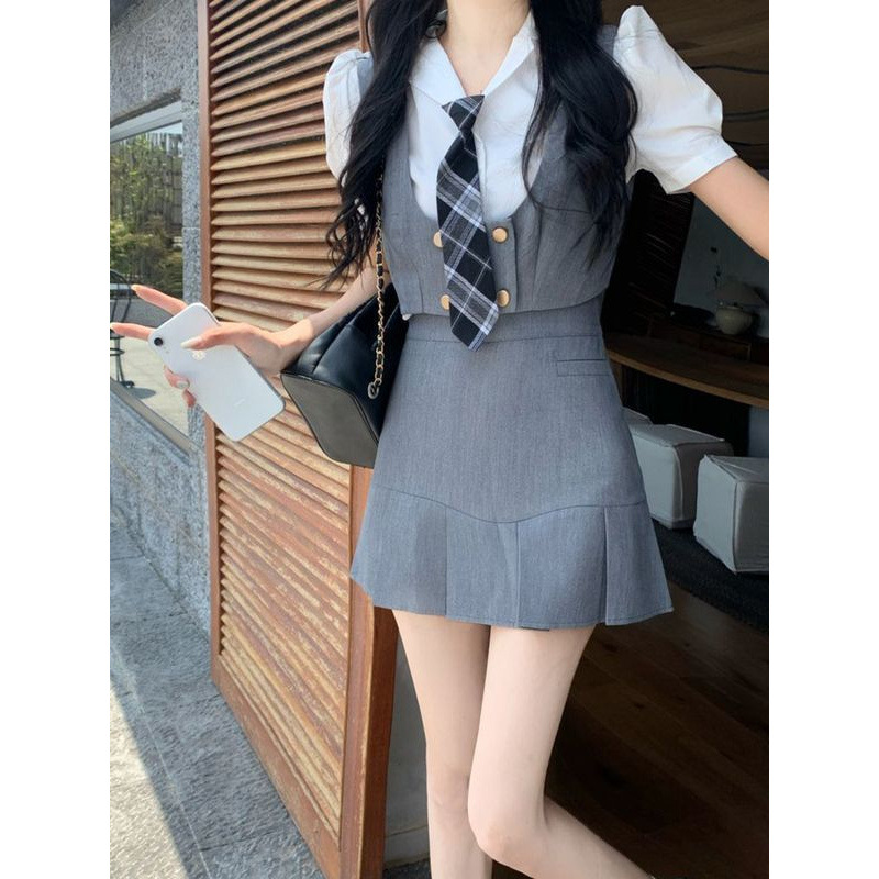 Setelan Dua Potong Lengan Pendek Warna Putih Musim Panas Wanita Gaun Setengah Tubuh Ketat Pinggang Tulang Ikan Setelan Seragam Jk Gaya Sekolah Gadis Pedas Amerika
