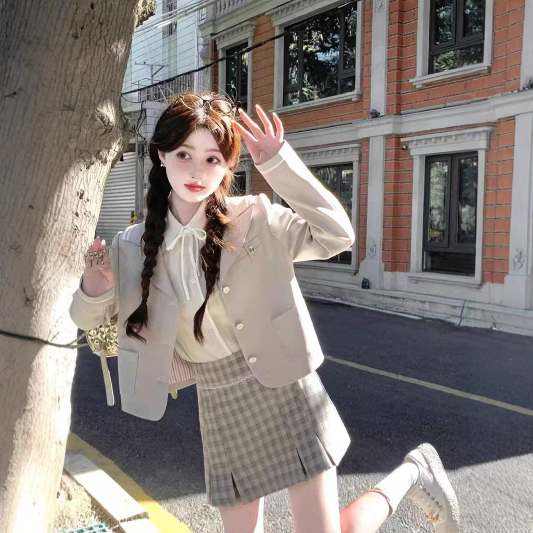 Setelan Gaya Akademi Inggris Jk Jaket Jas Musim Gugur Musim Dingin Seragam Rok Setengah Badan Pola Kotak Set Tiga Potong untuk Dipakai dalam Drama Korea