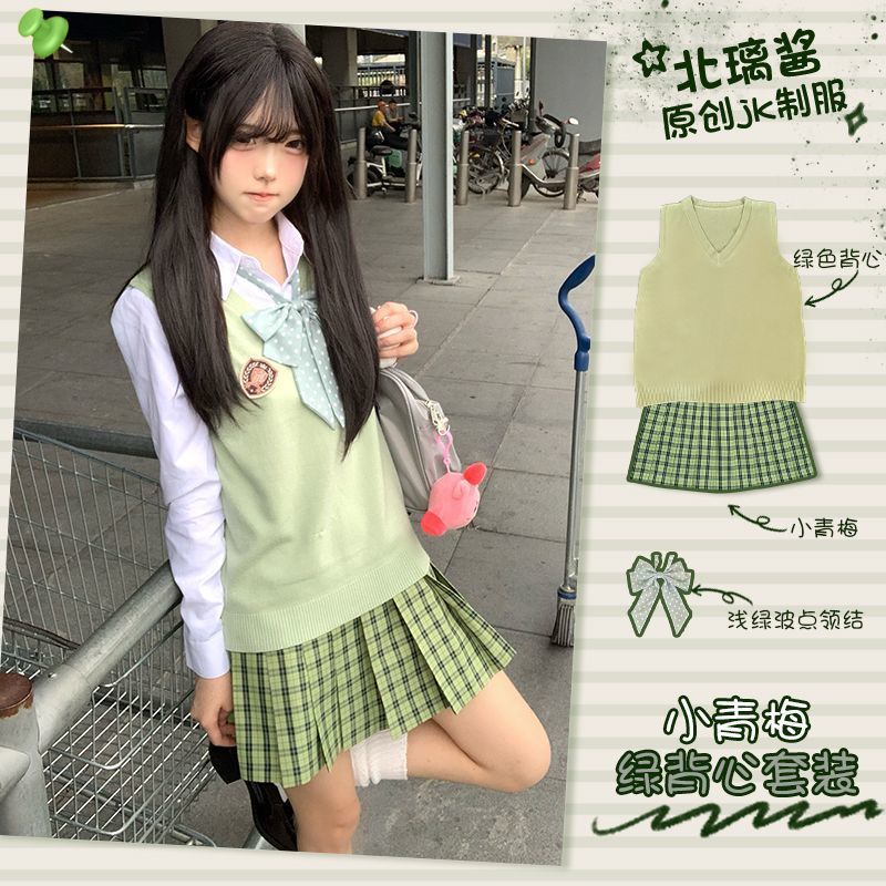 Pakaian Kelerasan Seragam JK Desain Baju Atasan Rok Lipit Gaya Hijau Segar dan Lembut Dua Set Baju Atasan Sederhana dan Elegan