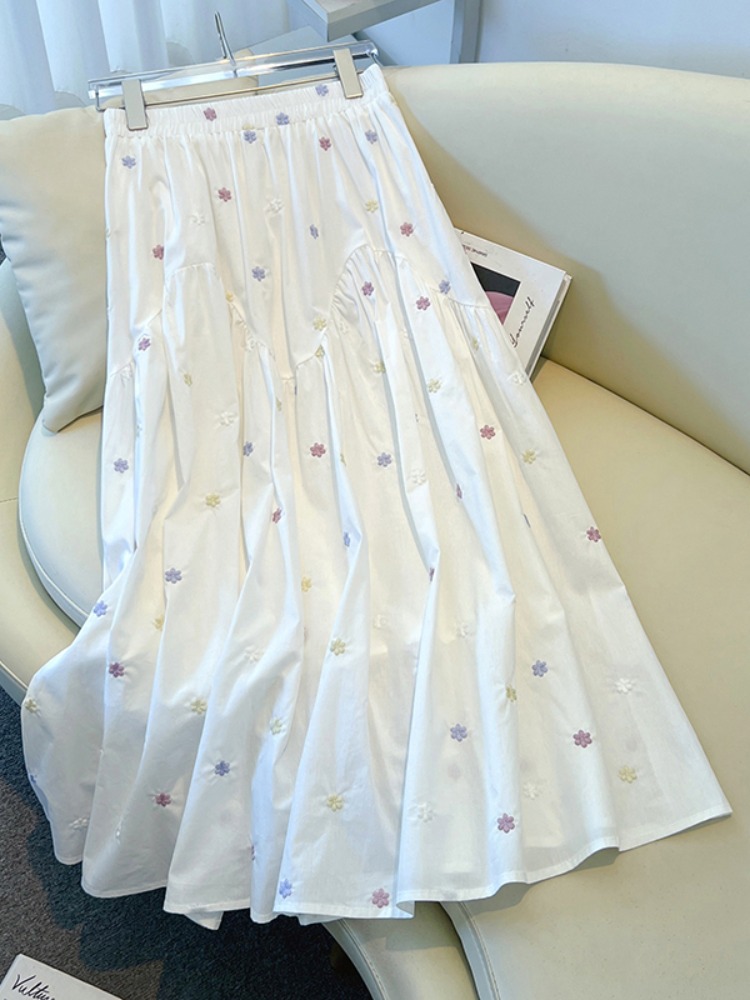 Rok Setengah Badan Warna Putih Lipit Bordir Sulam Gaya Desain Rok Panjang Besar Mudah Dipadu Padan Elegan Segar Musim Panas Wanita