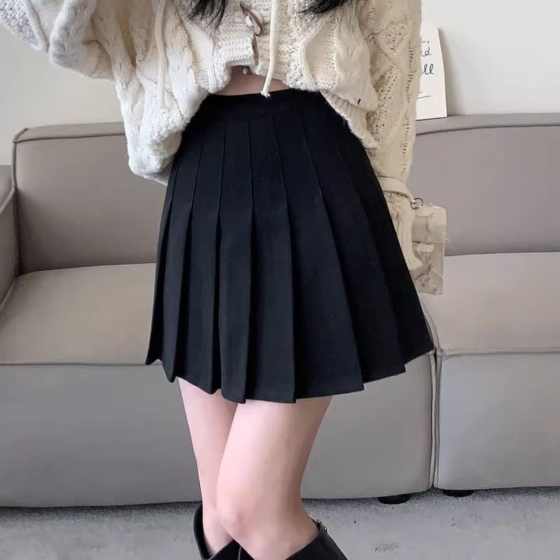 Rok lipit wanita musim semi dan musim gugur, rok a-line pinggang elastis pelajar jk, rok pinggang tinggi, pelangsing saku kecil