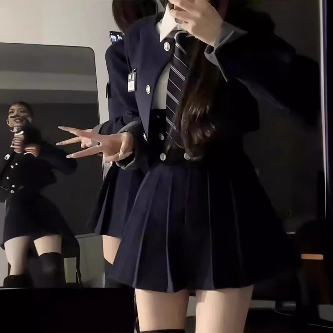 Setelan gaya preppy Korea Selatan jaket setelan pendek wanita JK rok seragam Musim Semi dan musim panas rok berlipat pelangsing pinggang tinggi setelan tiga potong