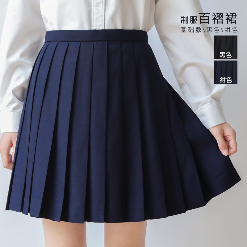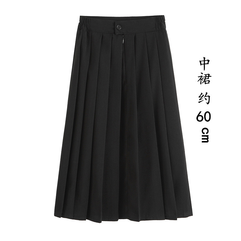 Rok lipit hitam pinggang elastis, rok lipit ukuran besar, pinggang elastis, rok seragam jk, model a-line musim semi dan musim panas, rok kuliah Jepang untuk wanita