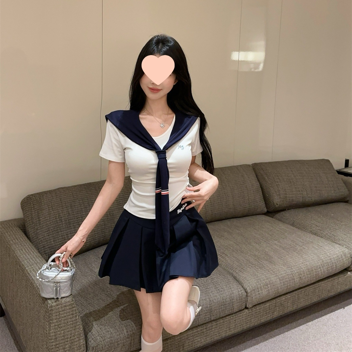 T-shirt Lengan Pendek Selendang Gadis Pedas Seragam Gaya Kampus Atasan Rok Lipit Huruf A Pinggang Tinggi JK Setelan Dua Potong