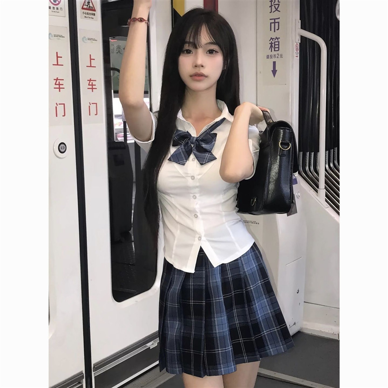 JK kemeja seragam wanita, rok gaun rok lipit musim semi dan musim panas setelan dua potong t-shirt lengan pendek musim panas