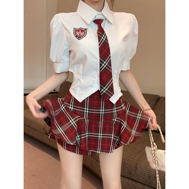 Setelan Pakaian Seragam JK Gaya Kampus Amerika Kemeja Lengan Pendek Kerah Pinggang Gadis Pedas Manis Musim Panas Rok Setengah Badan Pola Kotak Dua Set