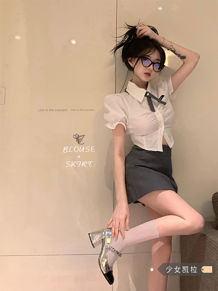 JK Kemeja Putih Pelangsing Pinggang Kemeja Terlihat Kurus Slim Fit Kemeja Warna Abu-Abu Murni Gadis Pedas JK Set Rok Lipit Seragam Wanita Musim Panas