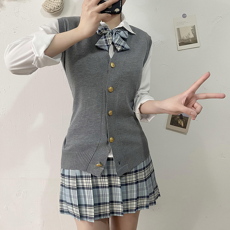 Setelan Rok Berkotak Seragam JK Model Tipis Gaya Kampus Sweater Kardigan Rajutan Murid Wanita Rompi Leher V