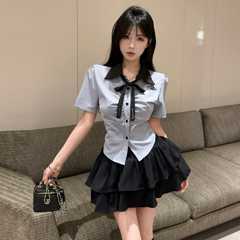 Setelan Rok Setengah Badan Pinggang Tinggi Atasan Lengan Pendek Mengurangi Usia Dua Potong Palsu Seragam JK Gaya Sekolah Murni Elegan Selebriti Internet