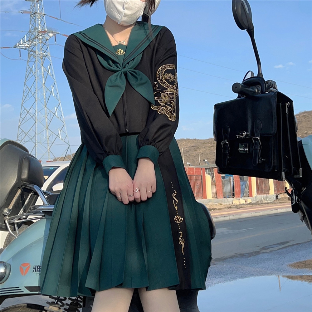 Qingji jk setelan seragam anak perempuan, set lengkap gaun pelaut gadis buruk gelap asli