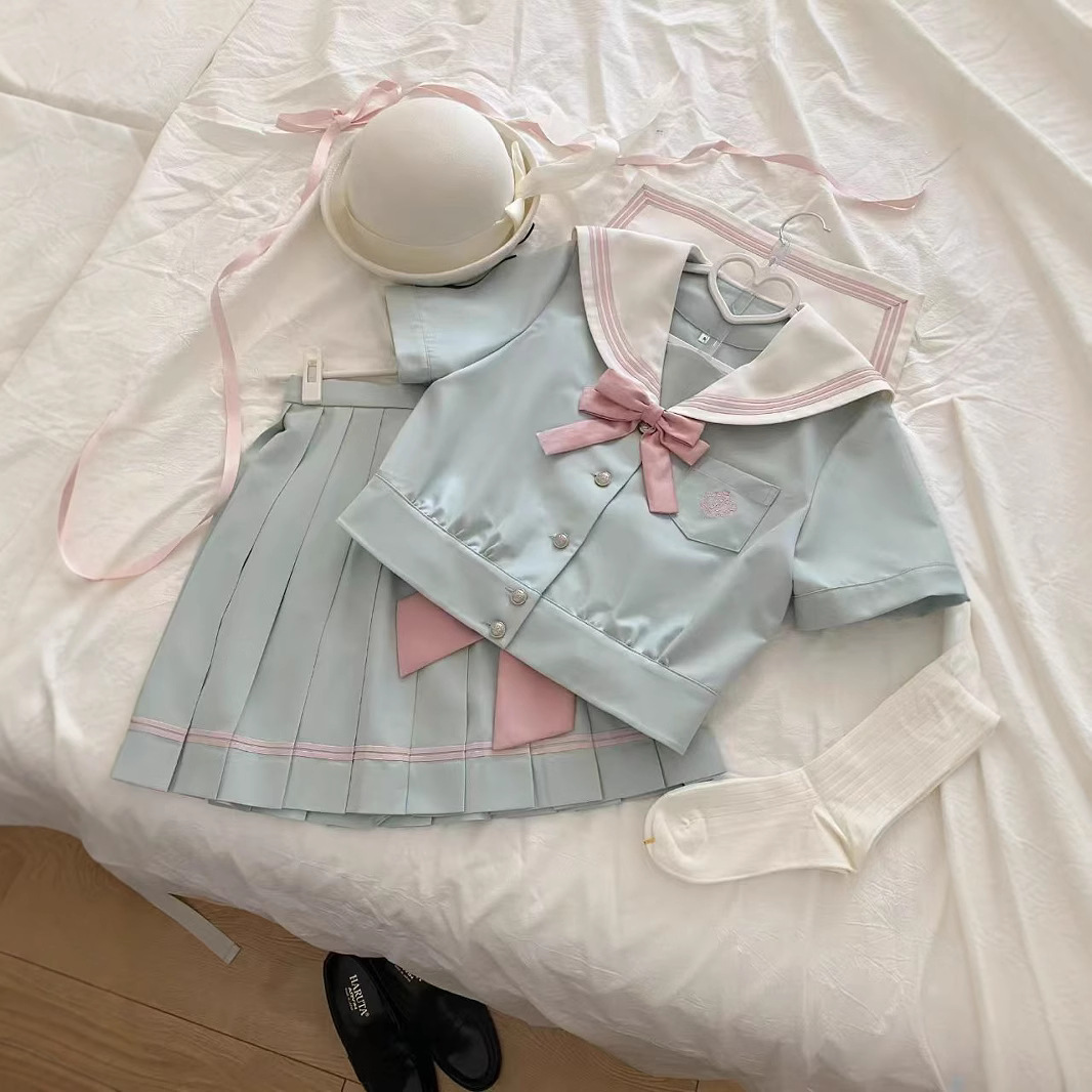 Musim Panas Sailor JK Seragam Setelan Wanita Pinggang Tinggi Terlihat Kurus Murid Mint Warna Biru Hijau