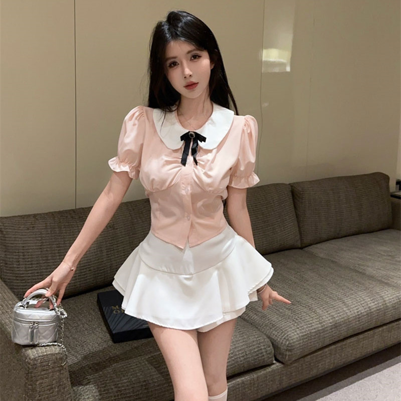 Setelan Dua Potong Kemeja Merah Muda Pelangsing Pinggang Gaya Kampus Manis JK Wanita Kecil Musim Panas Rok Pendek Warna Putih