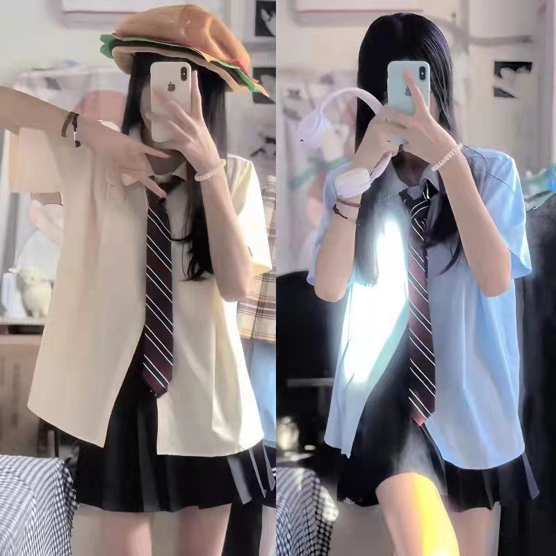 Setelan Baju Kemeja Lengan Pendek Wanita Seragam Gaya Perguruan Tinggi Jepang JK Rok Pendek Cake Bergaya Murni Gaya Pelangsing Pinggang Set Dua Potong