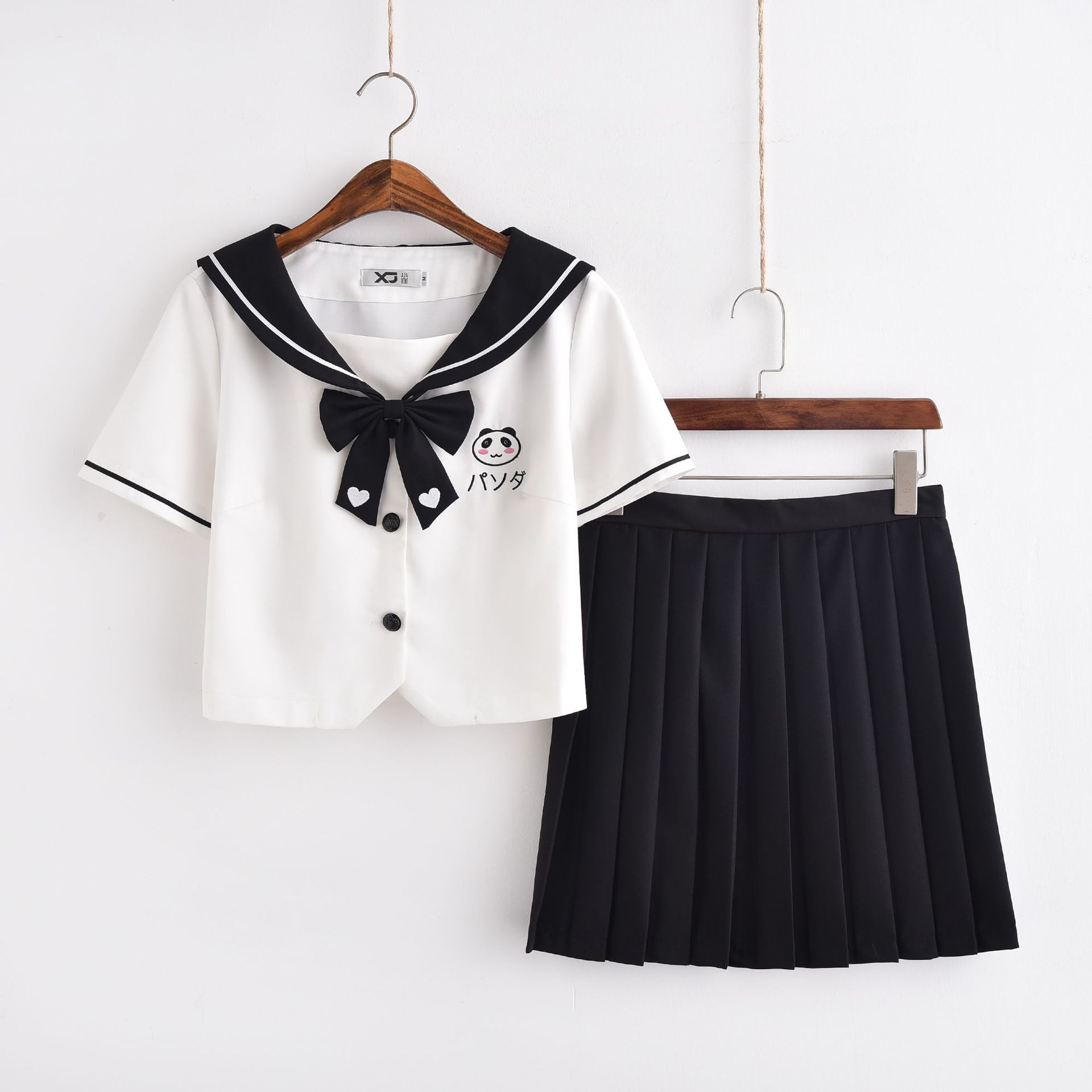 Setelan seragam pelaut wanita lengan pendek, pakaian siswa musim panas, pakaian pelaut, seragam JK, lengan pendek, bordir, panda, lucu, manis, Jepang