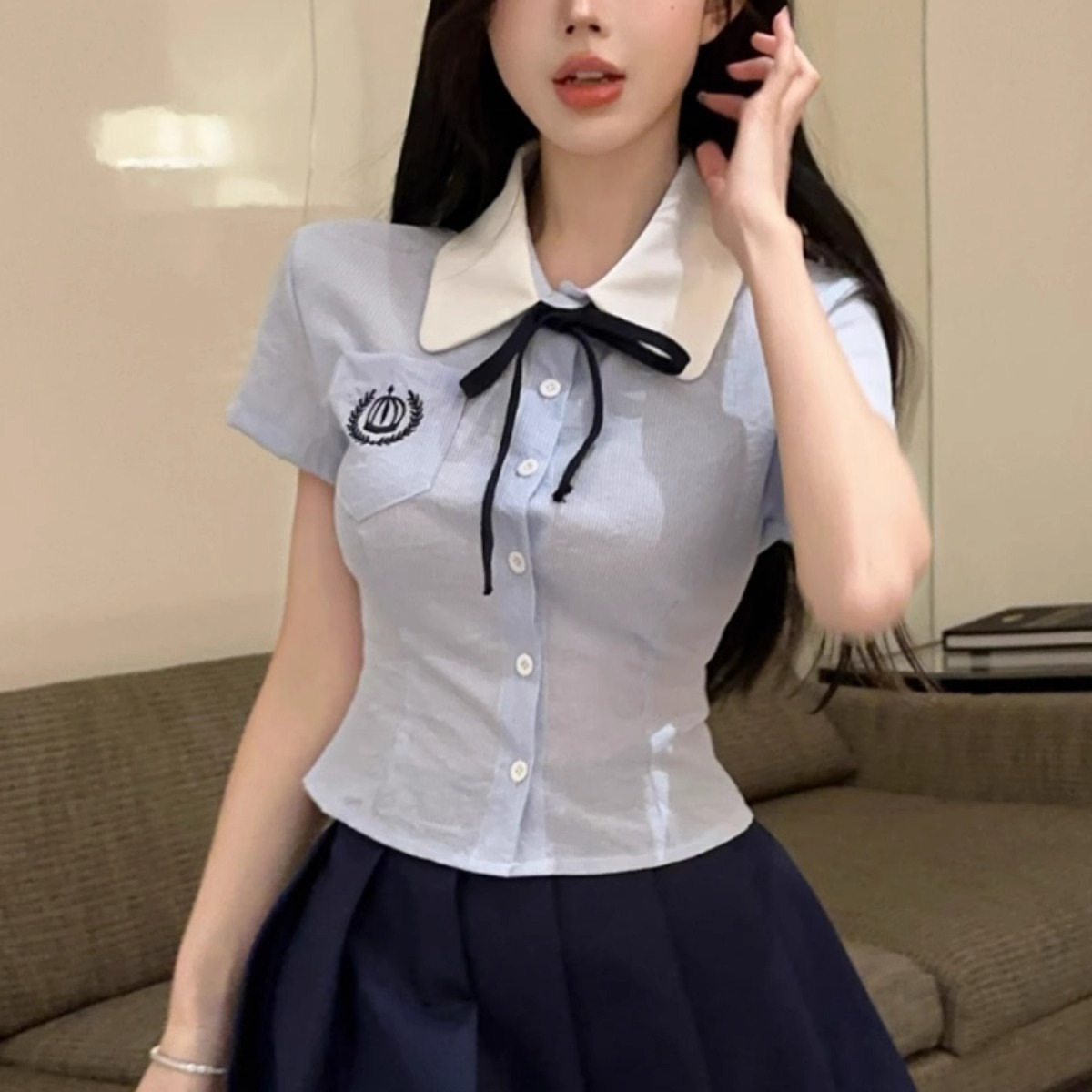 Kemeja JK Baju Atasan Wanita Musim Panas Lengan Pendek Gaya Desain Niche Seragam Slim Fit Kemeja Gaya Kampus Warna Biru