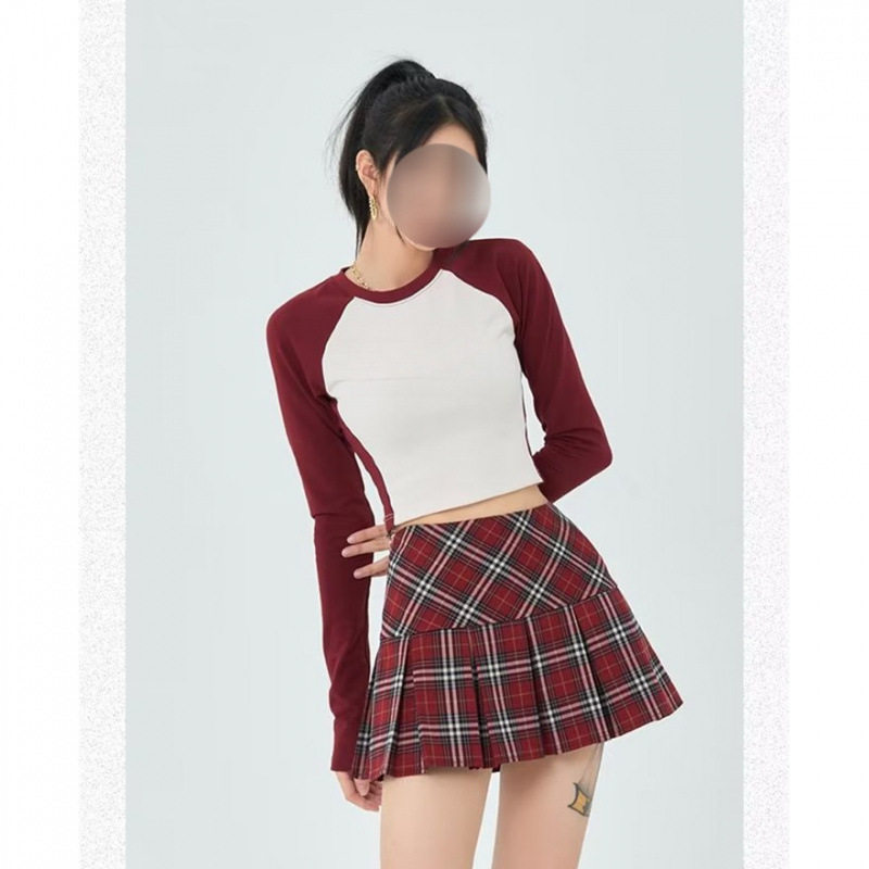 Rok Lipit Kotak-Kotak Merah Gaya Amerika Retro Rok Setengah Badan JK Gadis Pedas Gaya Desain Musim Semi Musim Gugur Rok Pendek Huruf A Gaya Kampus