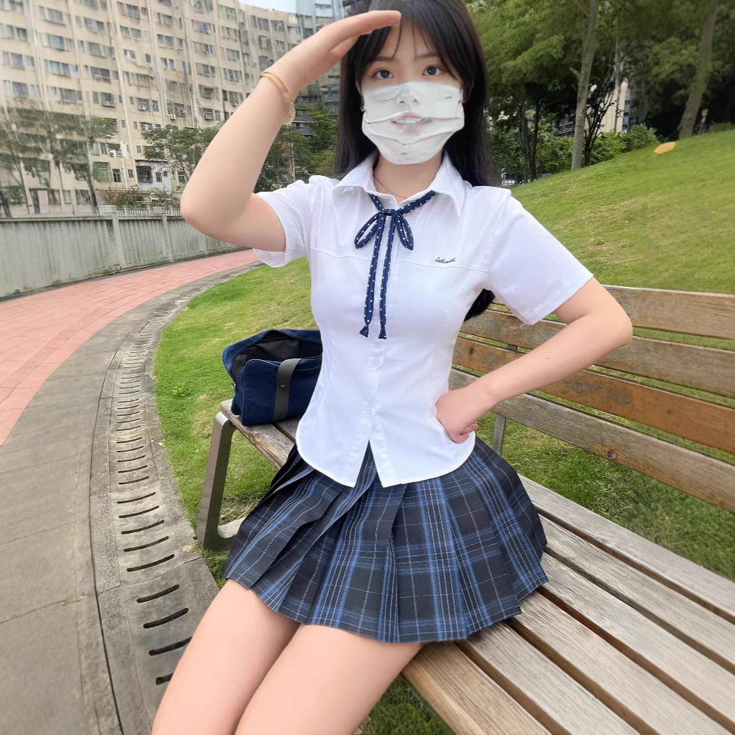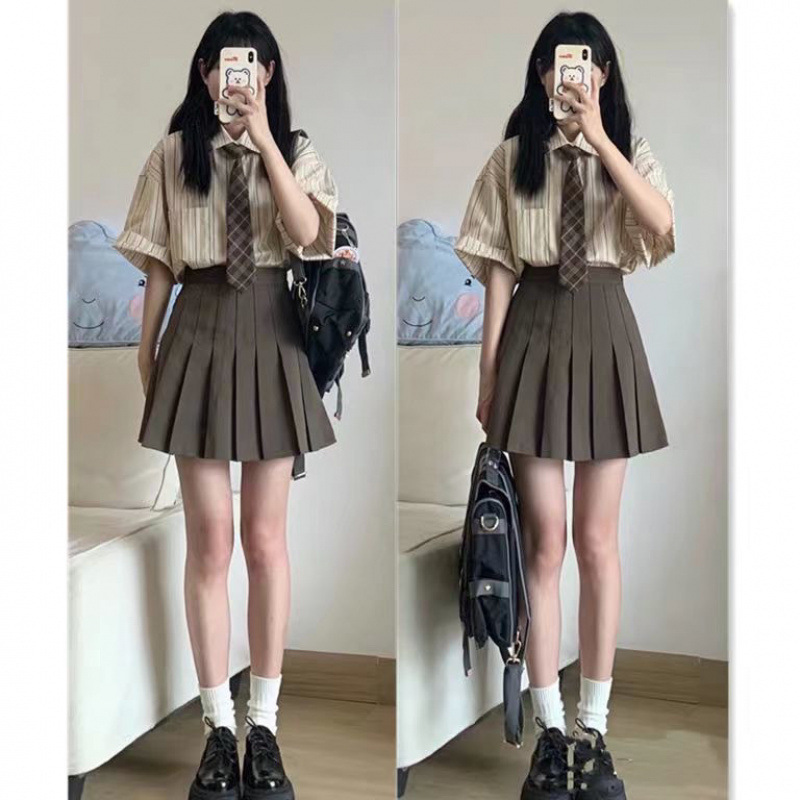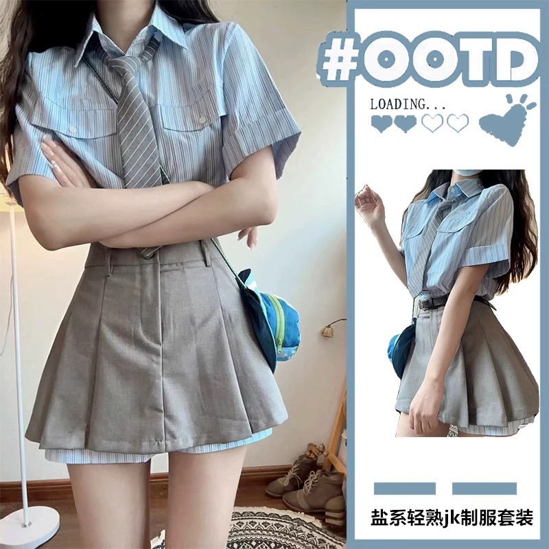 Setelan Seragam Tinggi JK Wanita Gaya Korea Kemeja Lengan Pendek Gaya Kampus Musim Panas Wanita Rok Setengah Badan Menutupi Pinggul Setelan Dua Potong