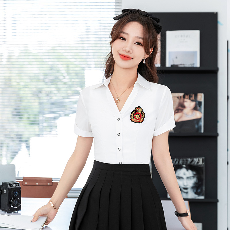 Kemeja wanita lengan pendek merah muda rok lipit gaya preppy pakaian bisnis Biliar hotel meja depan bar JK pakaian kerja musim panas
