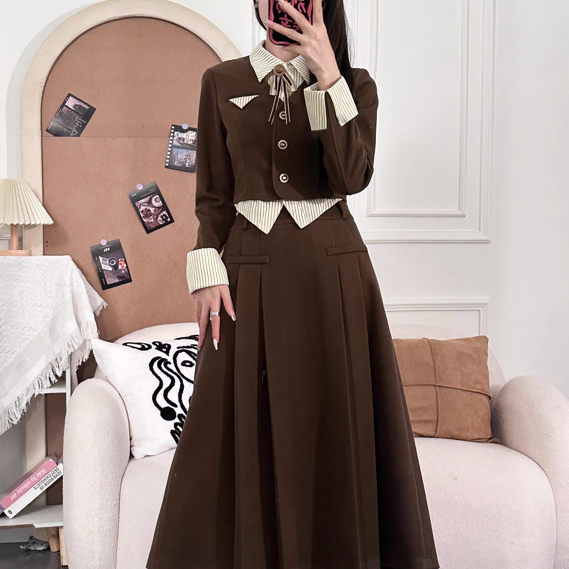 Kemeja Garis-Garis Gadis Bergaya JK Gaya Kampus Jaket Jas Model Pendek Rok Lipit Pinggang Tinggi Set Gaya Instagram