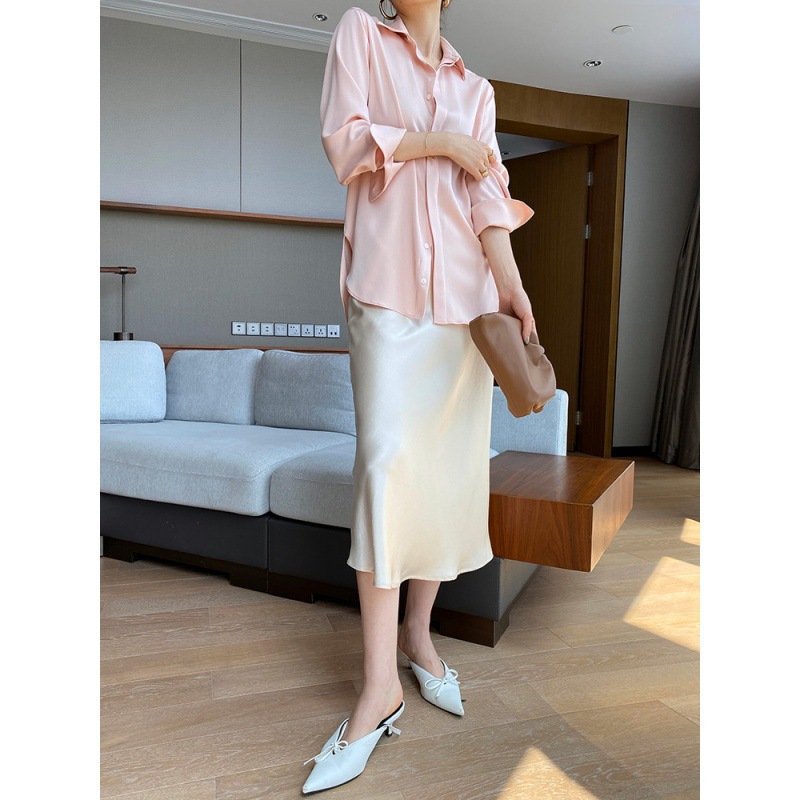 Rok wanita sutra triasetat pinggang tinggi, rok panjang setengah panjang musim panas satin tipis bentuk A- line