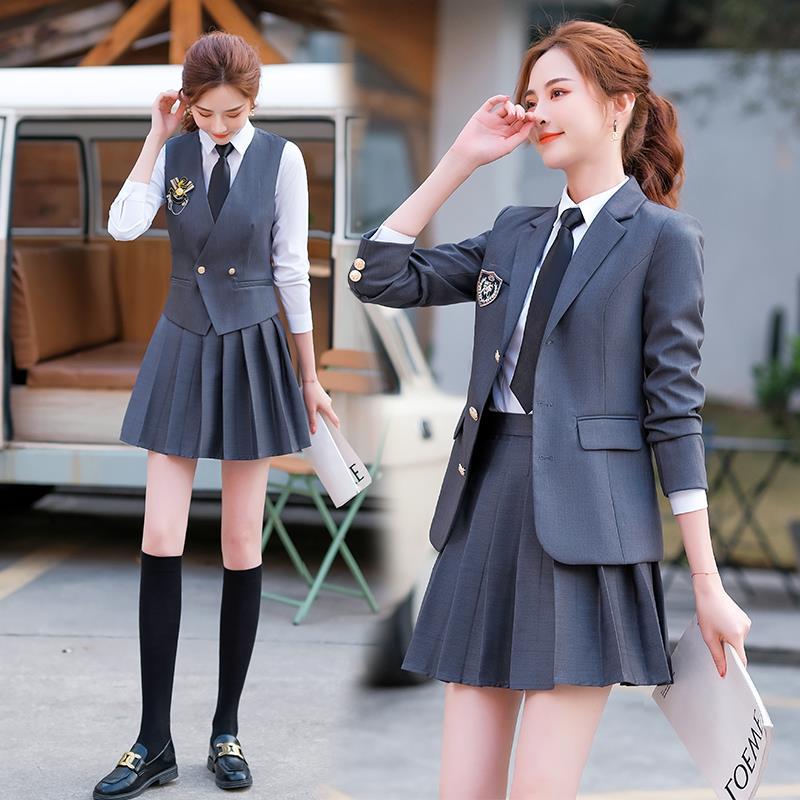 Setelan seragam sekolah pelajar elegan, setelan tiga potong gaya kuliah wanita, jaket seragam jk, set lengkap musim semi dan musim gugur