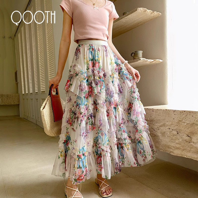 Rok Setengah Badan Kasa Bunga Warna-Warni Sambungan Rok Kue Elegan Gaya Pengadilan Prancis Musim Semi 2025 Wanita
