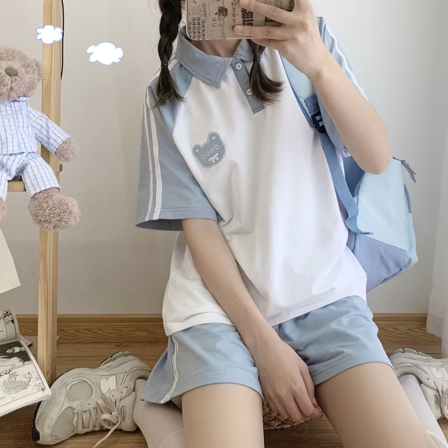 Kaos polo lengan pendek untuk sekolah, seragam sekolah imut Jepang, kaus polo lengan pendek, setelan celana pendek olahraga