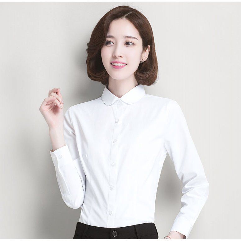 Kemeja putih wanita lengan panjang, pakaian bisnis Wanita Atasan Musim Semi dan Musim Gugur modis elegan pakaian formal gaya Korea baju overall siswa