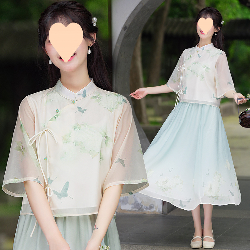 Setelan Pakaian Wanita Gaya Tiongkok Baru Murid Atasan Cheongsam Modifikasi Bercorak Pakaian Han Setelan Dua Potong Pakaian Seni Teh