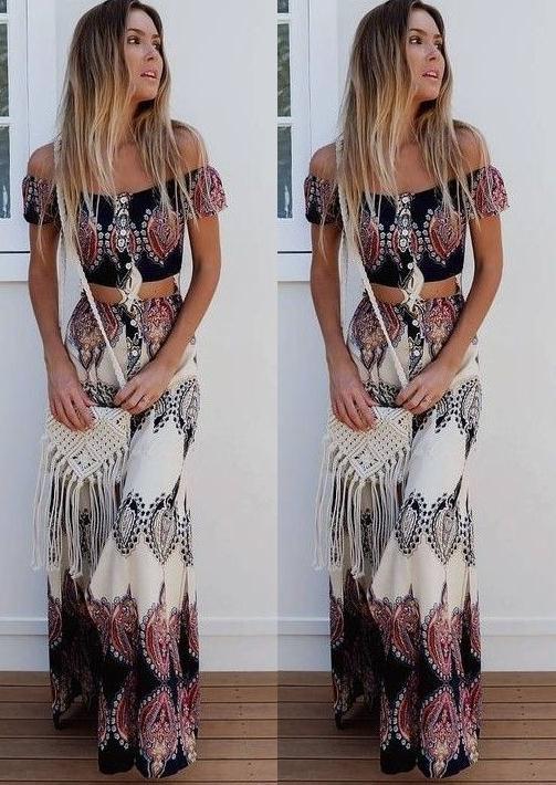 Rok motif vintage musim panas populer lintas batas Amazon AliExpress rok panjang setelan cetak off-neck dua potong