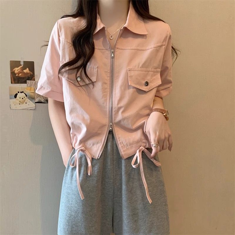 Kemeja Kerah Polo Ritsleting Ganda Gaya Desain Terlihat Langsing Atasan Lengan Pendek Pakaian Kerja Model Pendek Murid Model Baru Musim Panas