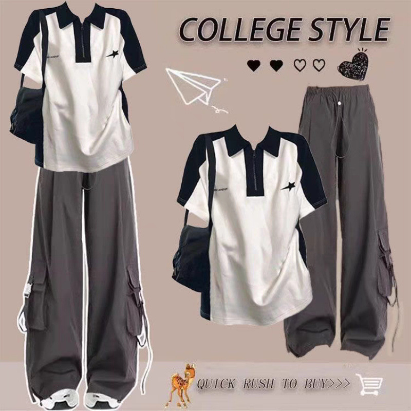 Set Modis Siswa SMP Kaos Lengan Pendek Gadis Jalan Bom Polo Celana Kerja Longgar Musim Panas Dua Potong Olahraga