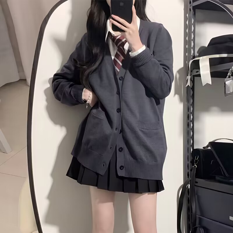 [Set Tiga Potong] Kardigan Rajutan Kerah V Elegan Modis Gaya Kampus Kemeja Wanita Rok Pendek Setengah Badan Siswa