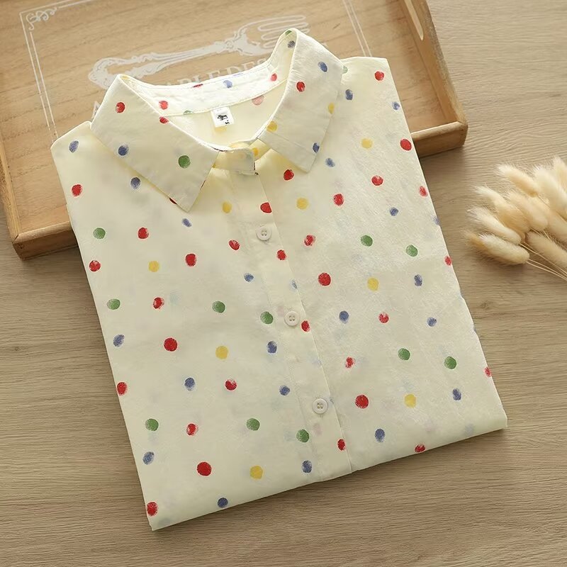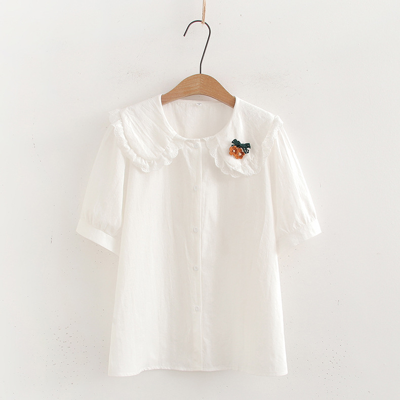 25035 Kardigan Longgar Bordir Kerah Boneka Bunga Kecil Warna Oranye Kemeja Putih Pelajar Perempuan Atasan Kasual Gaya Seni