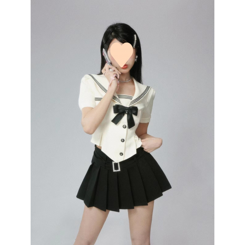 Pakaian Pelarian Seragam Gadis Pedas Gaya Sekolah Amerika Atasan Kerah Angkatan Laut Rok Lipit Pinggang Tinggi Rok Pendek Dua Set Musim Panas Wanita