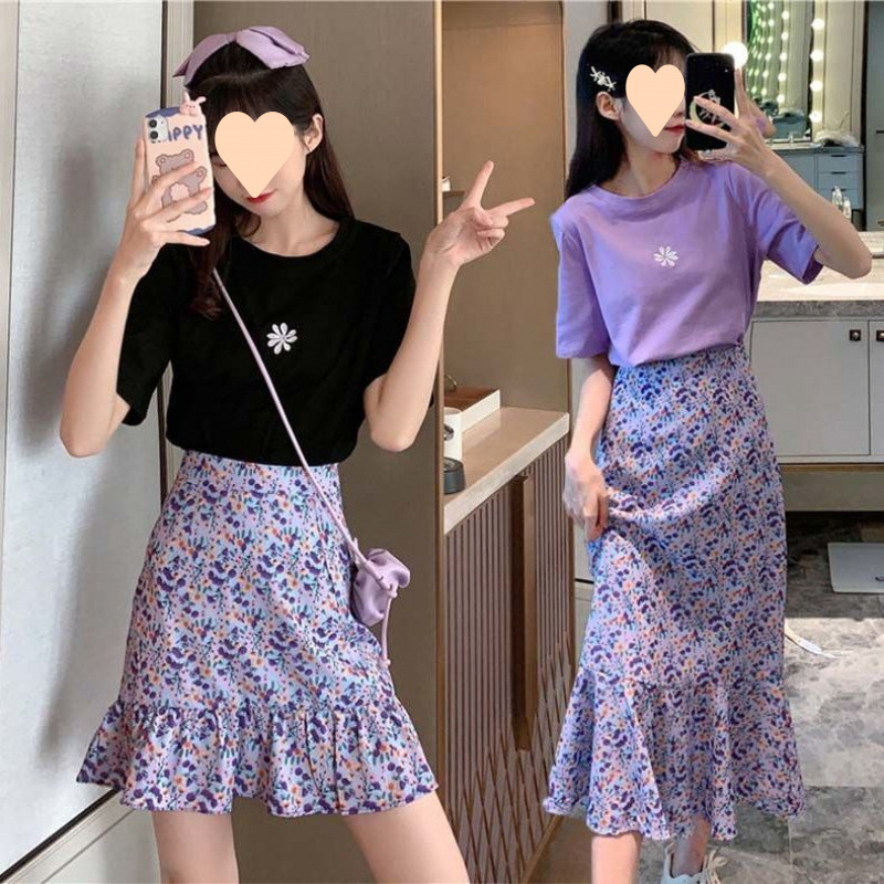 Rok Setengah Badan Sifon Musim Panas Rok Daun Teratai Ungu Pinggang Tinggi Gemuk Rok Ekor Ikan Model Panjang Sedang Murid Terlihat Kurus Ukuran Besar