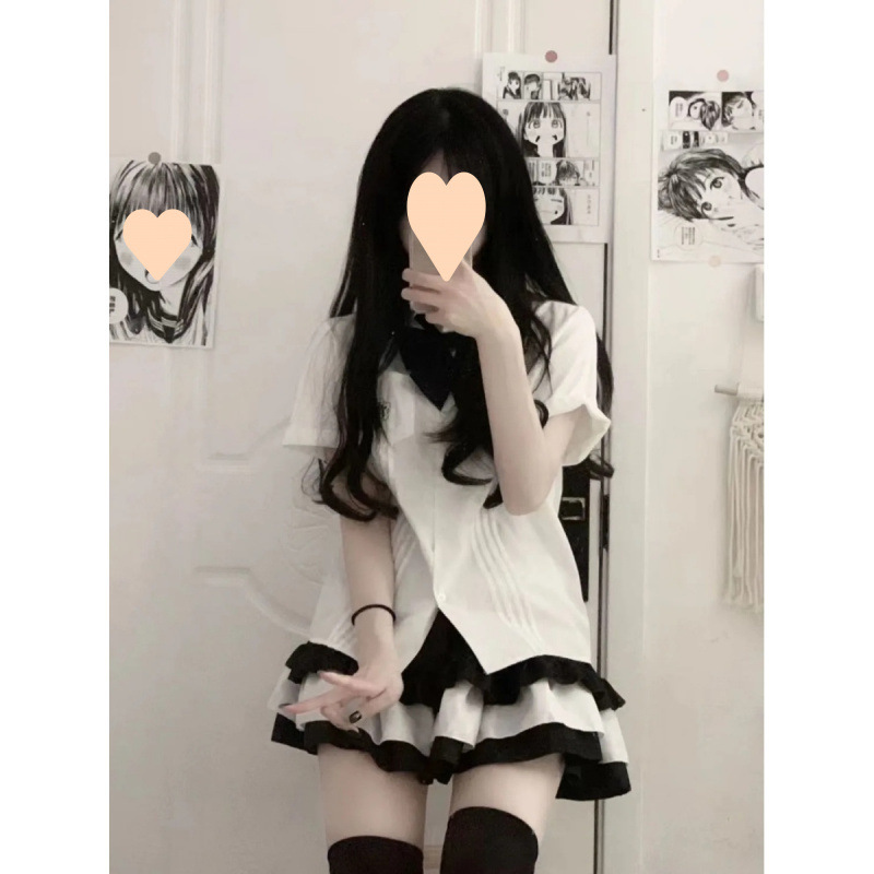 Hu Lieina Set Seragam Siswi Kemeja Lengan Pendek Gadis Lembut Longgar Longgar Wanita Rok Setengah Badan Kue Dua Set