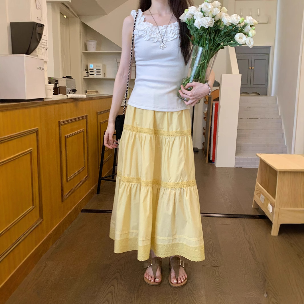 Rok Setengah Badan Kue Kuning Wanita Musim Panas 2025 Model Baru Versi Korea Pinggang Tinggi Terlihat Langsing Pinggang Elastis Mudah Dipadu Padan A-line