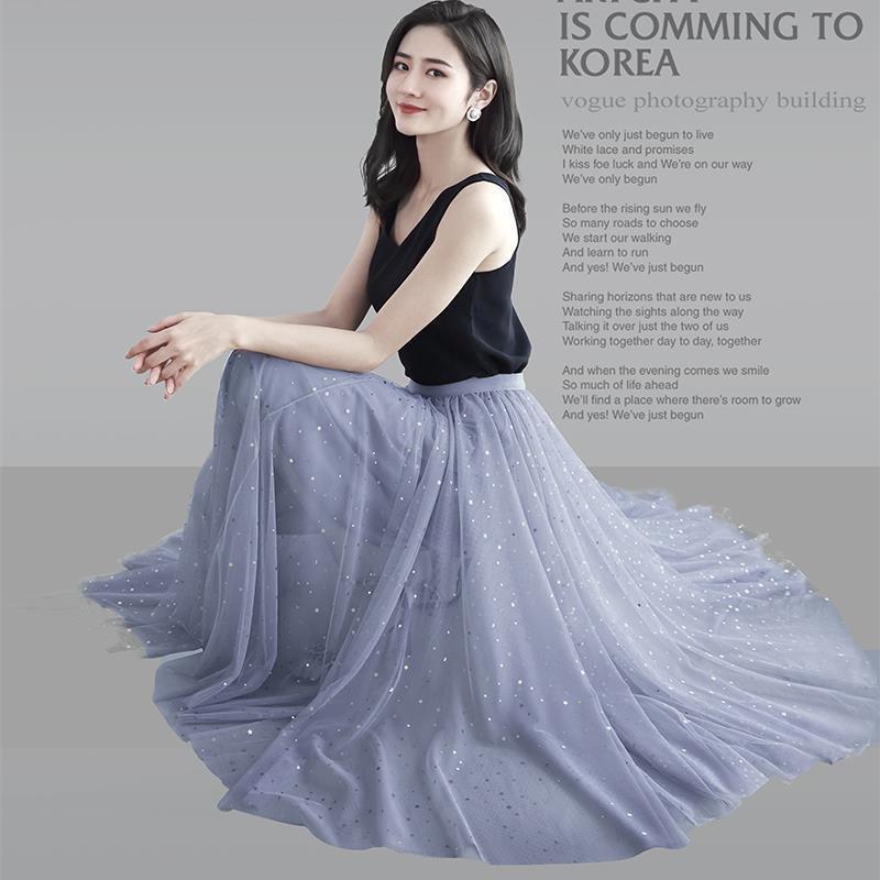 {2 lapis lapisan kain kasa} kain kasa payet model Korea pinggang tinggi terlihat kurus rok setengah panjang perempuan