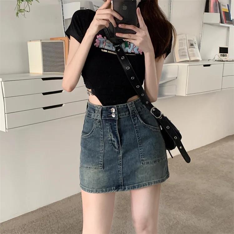 Rok Denim perempuan populer biru retro musim panas 2023 Korea Selatan rok Denim wanita siswa pinggang tinggi pelangsing a-line selubung anti-eksposur